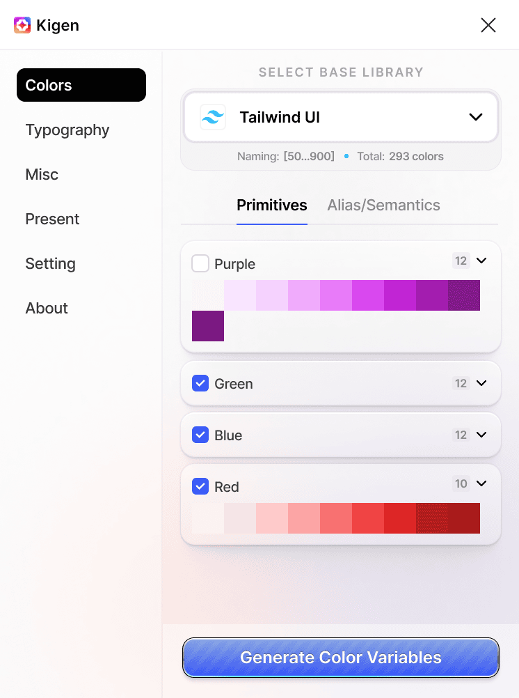 A faster way to start design systems. Use Kigen to create your core variables and styles in just a few clicks.